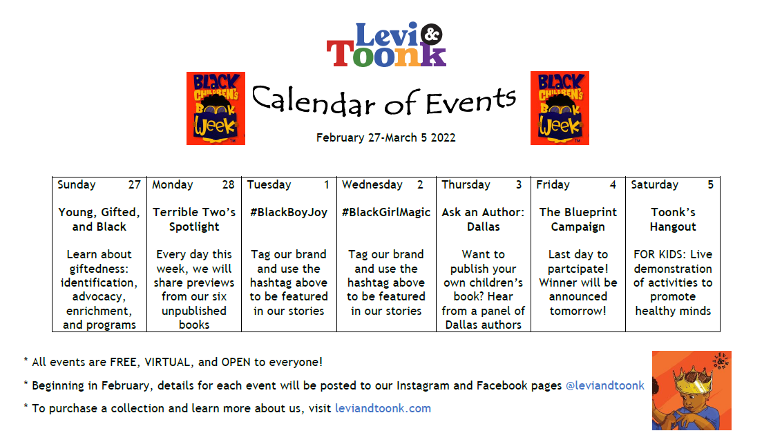 Considering our values, goals, and mission, we will be offering the attached programming as our contribution to the inaugural [and global] celebration of Black Children’s Book Week! Feel free to share our calendar of events and encourage families to participate in any way they can. We also ask that you share this groundbreaking initiative with any networks/groups/organizations who would like to get involved!
